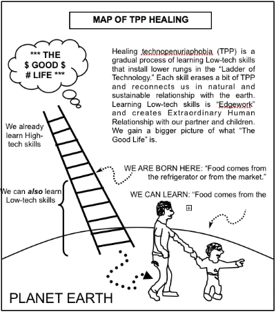 Unless we have made special efforts to train ourselves in outdoor living skills, we all have technopenuriaphobia bothering us deep in our soul. TPP decreases the number of options from which we can choose and thereby forces certain lifestyles upon us that we assume are without alternatives – “What do you mean I could wear out my old shoes before ordering new ones on the Internet?” “What do you mean unplug the TV?” If a high level of technology must be supported, we become like goldfish living precariously in a glass bowl in the desert.