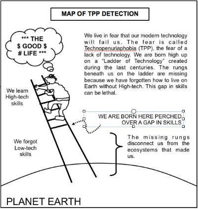 TPP is a particularly Western affliction because you must first live with advanced technologies for a generation before the next generation forgets that you ever did not have them. One-hundred-thousand years of hard-earned life-knowledge vanishes from our common inheritance during one generation of being a city dweller. Considering the virulent Westernization of the rest of the world, technopenuriaphobia will quite likely infect millions if not billions more in the near future.